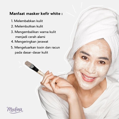 Medina Kefir Masker ini diklaim mampu mendetox kulit wajah dari beragam kerusakan wajah akibat penggunaan cream berbahan kimia. Bahan-bahan antioksidan dan antiinflamasi dikatakan mampu berperan dalam memperbaiki struktur wajah, menghaluskan, melembutkan, mencerahkan, serta mengecilkan pori2.