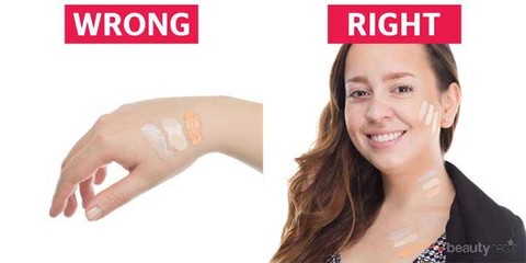 Ingat, tujuan penggunaan foundation adalah untuk meratakan warna kulit wajah, bukan tangan. Warna kulit tangan dan wajah belum tentu sama, bukan? Sebaiknya kamu mencoba warna foundation di area rahang hingga ke leher.