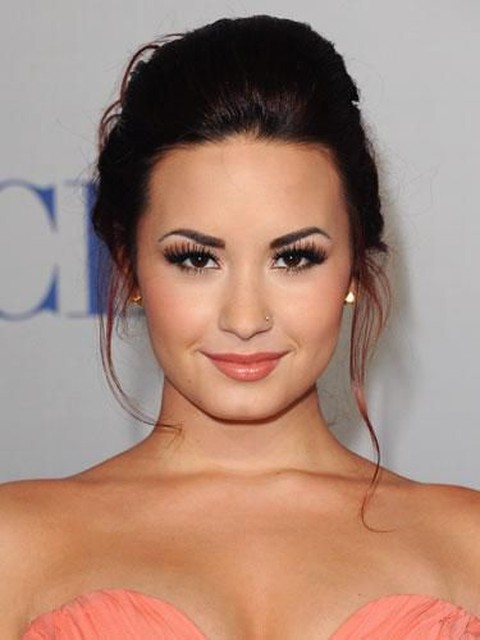 Demi Lovato tampak anggun dan flawless dengan lipstik berwarna coral, peach blush-on, serta eye shadow berwarna cokelat terang.
