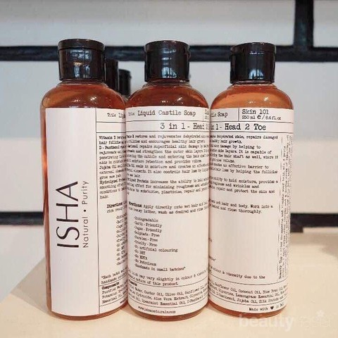 Isha Liquid Castile Soap 3 in 1Head 2 Toe merupakan sabun skincare untuk badan selaigus bisa kamu pakai untuk perawatan rambut secara alami. Formulanya yang ringan membantu untuk melembapkan kulit sekaligus merawat rambut yang rusak. Skincare routine ini mengandung bahan-bahan alami seperti, vitamin E yang bermanfaat untuk meremejakan kulit, melembapkan serta memperbaiki pertumuhan rambut. Kemudian panthenol yang bermanfaat untuk meremajakan dan memperbaiki lapisan kulit luar, kemudian kandungan minyak jojoba yang bermanfaat untuk memperbaiki rambut yang rontok dan kandungan hydrolyzed protein yang bermanfaat menghalsukan kulit serta bermanfata sebagai anti aging.