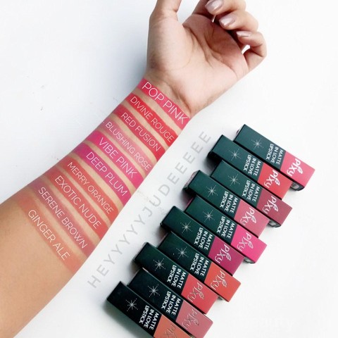 Pixy Matte in Love ini hadir dalam 10 shades dan semua warna lipstiknya termasuk wearable untuk daily make up. Shade-nya didominasi dengan warna pink, mulai dari warna lipstik pink bold hingga nude. Tipikal warna yang aman untuk semua jenis kulit. Warna-warna yang tersedia adalah Pop Pink, Divine Rouge, Red Fusion, Blushing Rose, Vibe Pink, Deep Plum, Merry Orange, Exotic Nude, Serene Brown, dan Ginger Ale. Buat kamu pecinta lipstik pink dan nude pasti langsung jatuh cinta dengan lipstik ini!