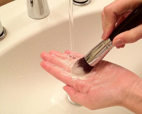 Langkah pertama dalam membersihkan kuas makeup adalah membasahi bulu-bulu kuas dengan air dingin. Untuk kuas foundation Minasan bisa merendamnya sebentar dalam larutan sabun dan air. Rendamlah hanya bagian bulu kuas saja, usahakan untuk tidak mengenai bagian besi karena dapat mengurangi lem yang merekatkan bulu-bulu kuas dengan gagangnya.