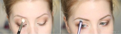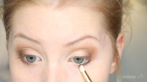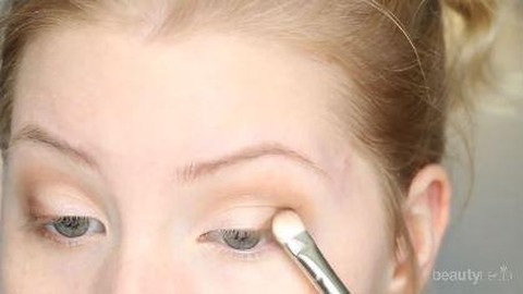 Setelah mengaplikasikan foundation, langkah selanjutnya yaitu merias area mata. Pertama-tama, gunakan eye primer pada kelopak mata. Setelah itu, ambil eyeshadow shade taupe lalu sapukan pada atas kelopak mata, tepatnya di bagian atas garis lipatan kelopak mata.