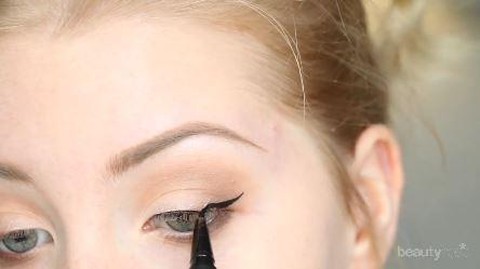 Aplikasikan eyeliner untuk menggaris garis mata bagian atas. Buar wings eyeliner agar tampilan mata semakin menarik.
