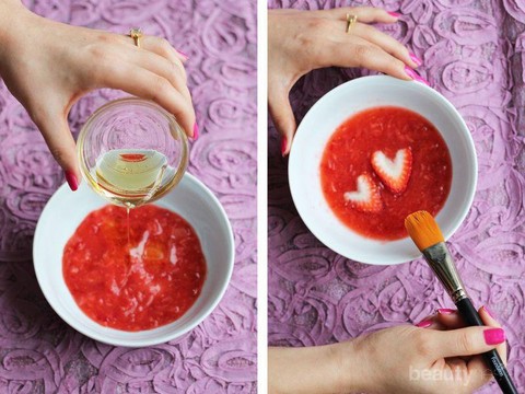 1. Lumatkan buah strawberry sampai hancur. 2. Tambahkan 1 sendok teh madu atau dapat diganti dengan yoghurt tanpa rasa. 3. Diamkan selama 30 menit. 4. Bilas dengan menggunakan air dingin.https://kumpulan.info/cantik/tips-kecantikan/68-cantik-dengan-strawberry.html |