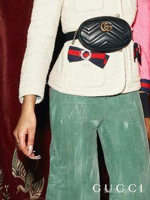 Clutch bag berbentuk oval yang tersambung dengan tali berupa belt atau ikat pinggang dan membuatnya jadi berbentuk fanny pack atau tas pinggang. Sebenarnya, Gucci Marmont ini terbuat dari dua bahan yang berbeda. Tas wanita ini ada yang terbuat dari bahan leather atau kulit dan tersedia dalam warna merah, hitam, dan baby pink. Sedangkan yang terbuat dari bahan velvet ini tersedia dalam warna yang lebih beragam seperti black, magenta, turquoise, pink and sapphire blue.