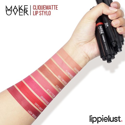 Make Over Cliquematte Lip Stylo ini punya 8 pilihan shade warna. Nama-nama shade-nya antara lain adalah 201- Eclaire, 202-Hollywood, 203-Crush, 204-Flamingo, 205-Jetsetter, 206-Grandiose, 207-Lady Boss, 208-Spotlight. Terdapat 3 shade warna dengan nuansa pink yaitu Hollywood, Flamingo, dan Jetsetter. Lalu terdapat 3 shade warna bernuansa merah yaitu Grandiose, Lady Boss, dan Spotlight. Shade pertama, Eclaire memiliki nuansa warna coklat, sedangkan shade Crush memiliki nuansa warna pink cenderung peach.