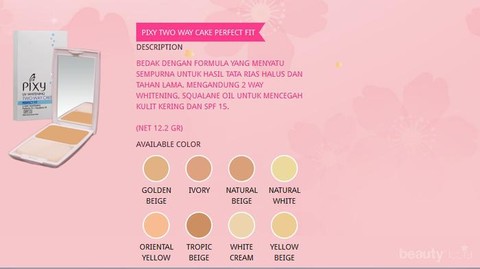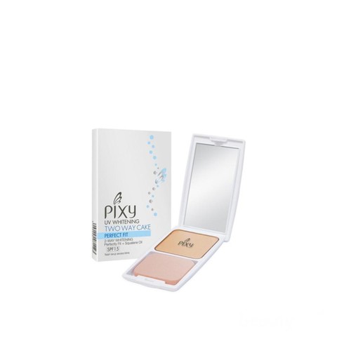 Pixy Two Way Cake perfect fit merupakan salah penyempurna makeup kamu untuk mendapatkan hasil makeup yang merata sempurna. Produk ini mengandung ekstrak alami kanzo dan anti bacterial yang bermanfaat untuk mencegah bakteri penyebab jerawat. Produk ini memiliki packaging dengan warna kombinasi antara biru muda dan putih yang merupakan warna dari brand Pixy itu sendiri. Terdiri atas dua tempat yang terpisan yakni digunakan sebagai tempat spons dan satunya untuk produk two way cake-nya sendiri. Seperti produk two way cake pada umumnya, produk ini juga memiliki kaca. Dan Pixy Two Way Cake Perfect perfect fit ini diclaim cocok untuk jenis kulit yang kering dan cocok digunakan untuk makeup pemula. Kamu bisa mendapatkan produk ini dengan harga Rp 35.000 saja lho.