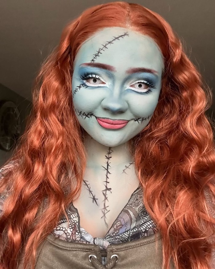 Gunakan base biru muda di seluruh wajah, kemudian gambar “jahitan” dengan eyeliner cair hitam. Lengkapi riasan dengan lipstik merah matte dan sedikit blush agar kulit birumu tetap terlihat hidup. Riasan ini akan membuatmu tampak seperti keluar langsung dari dunia Tim Burton yang spooky tapi tetap adorable.