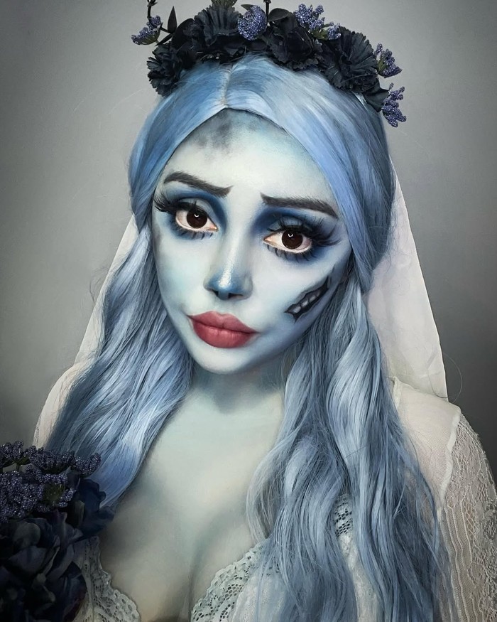 Tampilan ini selalu jadi legenda setiap Halloween. Corpse Bride punya daya tarik tersendiri yang menampilkan kesan seram yang sekaligus melankolis. Makeup berfokus pada kulit biru pucat, mata besar dan rona kelabu yang elegan. Cocok buat Beauties yang ingin tampil seram tapi tetap anggun.