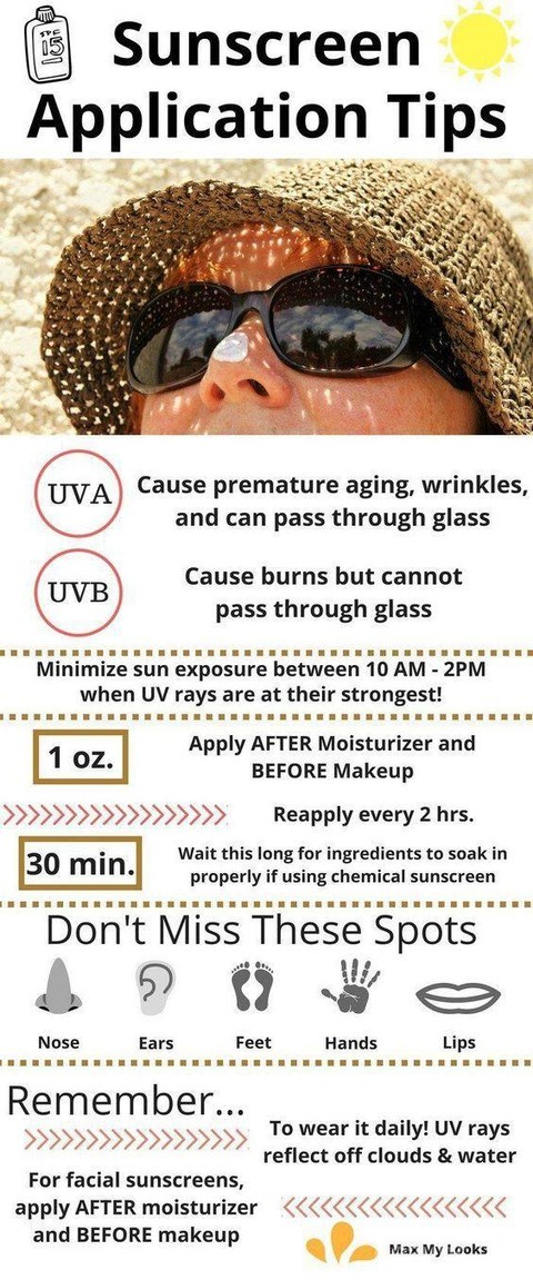 Foto: https://id.pinterest.com/Supaya lebih maksimal, jangan hanya mengoleskannya satu kali saja dan cepat-cepat menimpanya dengan makeup. Kulit perlu diberi waktu untuk lapisan pertama produk skincare sunscreen tersebut meresap. Lalu barulah timpa lapisan yang kedua. Takarannya adalah dua ruas jari untuk satu muka sampai leher dan telinga.