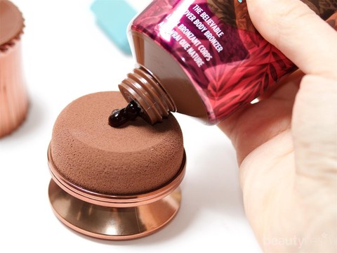 - Oleskan gel Benefit Hoola Zero Tanlines Body Bronzer keatas aplikator spons lalu oleskan kebagian tubuh yang kamu ingin coklatkan