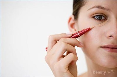 Kantong mata merupakan hal yang paling jelas terlihat saat wajah kamu lelah. Jadi trik makeup pertama yang harus kamu lakukan adalah menutupi kantong mata tersebut. Cara menutupi kantong mata adalah dengan mengaplikasikan concealer. Aplikasikan concealer dengan warna setingkat lebih cerah untuk menyamarkan kantong mata kamu.