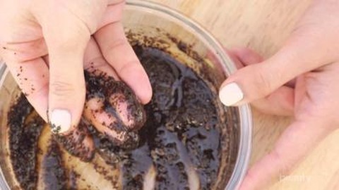 Siapkan sebuah wadah, masukkan ampas kopi dan tambahkan minyak zaitun sedikit per sedikit sambil diaduk hingga bentuknya menjadi seperti pasta.