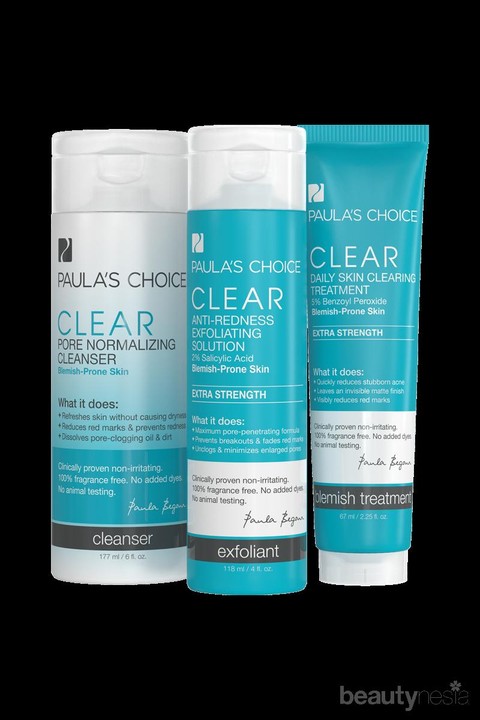 Paula's Choice Clear Extra Strength Kit ini biasanya dijual dalam bentuk paket. Jadi, kamu enggak perlu bingung rangkaian apa saja yang dikhususkan untuk treatment jerawat di wajah kamu. Kit ini terdiri dari 3 produk: