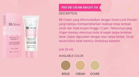 Salah satu merek kosmetik lokal yang sudah lama melayani kebutuhan kosmetik para wanita Indonesia yaitu Pixy, mengeluarkan produk BB Cream yang terdiri dari 3 shades yaitu beige, cream & ochre. Semua shade BB cream dari Pixy mengandung SPF 30 & PAA++ yang dapat melindungi wajah kamu dari paparan sinar matahari yang dapat merusak jaringan kulit.