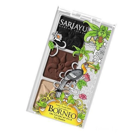 Ciri khas produk Sariayu terletak pada inspirasi penggunaan nama dan warna yang selalu identik dengan kebudayaan Indonesia. Salah satunya adalah Eyeshadow Borneo yang terinspirasi oleh kebudayaan dan kekayaan Kalimantan. Terdiri dari 3 warna, yaitu hitam, cokelat tua, dan cokelat muda. Warna eyeshadow ini tergolong eyeshadow natural yang pas untuk tampilan sehari-hari. Hasilnya sudah pasti sangat pigmented dan tahan lama. Produk ini mengandung ekstrak buah delima, Vitamin E sebagai anti oksidan, dan mineral Amethyst yang menjaga kelembaban kulit. Harganya Rp 57.000.