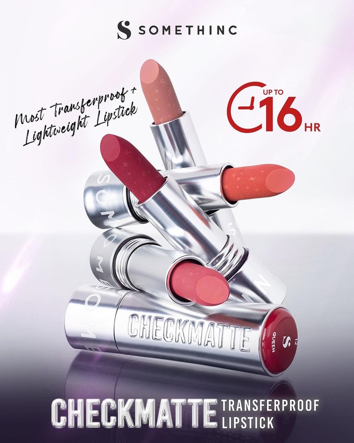 Checkmatte Transferproof Lipstick dari Somethinc sempat viral karena packaging yang cantik dan emboss logo langsung pada produk. Lipstik ini diklaim memiliki ketahanan hingga 16 jam karena menggunakan teknologi ColorGrip yang dapat langsung memberikan warna nyata hanya dengan satu kali usapan.