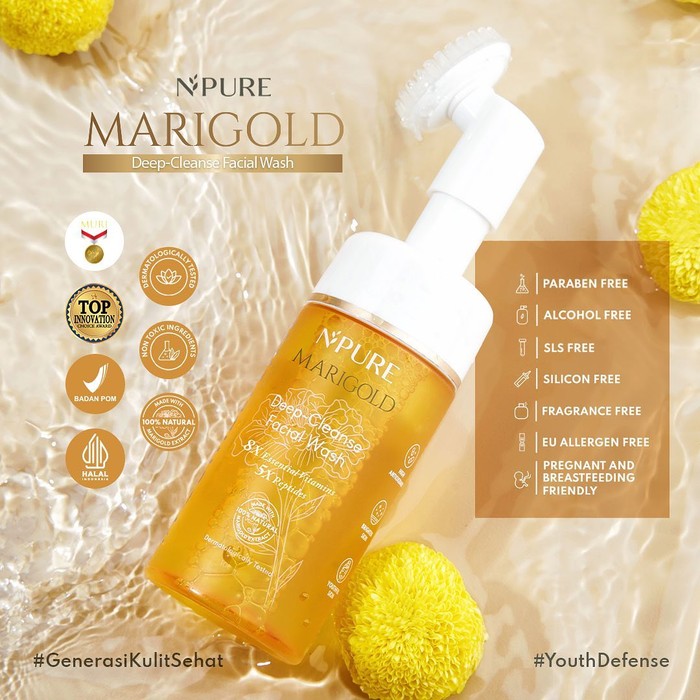 Kamu bisa mencoba Npure Marigold Deep Cleanse Facial Wash sebagai first cleanser. Terdapat kandungan 8x Essentials Vitamin, Calendula Extract, dann 5x Peptides yang dikenal ampuh untuk mencegah penuaan dini. Produk ini diklaim dapat membuat wajah tampak lebih muda. Sudah dilengkapi brush pembersih, Npure Marigold Deep Cleanse Facial Wash dibanderol dengan harga Rp80 ribu untuk ukuran 100 ml.