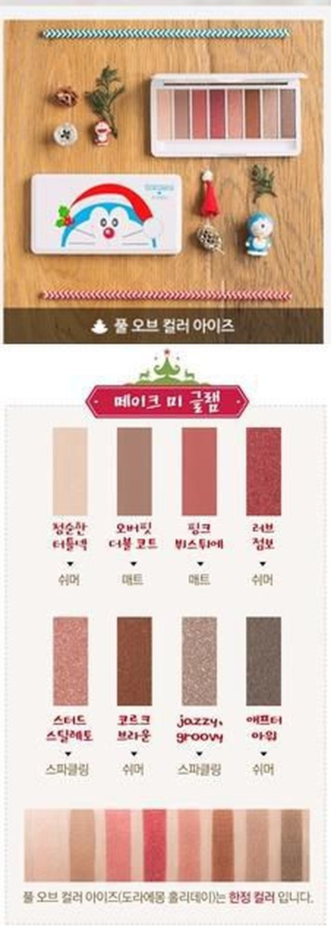 Packaging dari eyeshadow ini tidak jauh berbeda dari seri Doraemon sebelumnya, namun karena ini adalah edisi spesial natal, maka Doraemon juga berdandan ala santa Klaus dengan topi merahnya. Eye shadow ini mengandung campuran ekstrak bunga melati dan mawar yang baik untuk kulit mata yang sensitif.