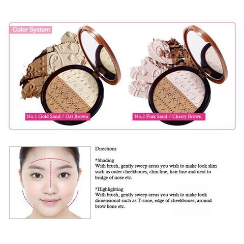Untuk cara pemakaian shading: usapkan bagian yang warnanya lebih gelap dengan brush di bagian yang ingin terlihat lebih ramping seperti luar tulang pipi, bagian pinggir hidung, garis dagu, area anak rambut, dll.