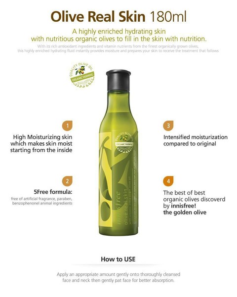 Foto: https://korshop.net/product/innisfree-olive-real-skin-ad/ Nah, toner yang satu ini juga bertujuan untuk melembabkan kulit dengan kandungan bahan yang berkualitas, yaitu olive oil. Buah zaitun yang digunakan pun bukan sembarangan, melainkan jenis golden olive yang disebut memiliki kualitas terbaik. Dengan kandungan extra virgin olive oil berkualitas dari Pulau Crete, Yunani, toner ini akan menutrisi kulit dan menjaga kelembaban kulit agar selalu terlihat sehat.