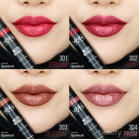 Sesuai namanya, Make Over Melted Metallic Lip Cream  mempunyai tekstur creamy seperi mouse yang lembut dan halus banget. Pigmentasinya juga bagus banget, lho. Oleh sebab itu, lipstik satu ini mudah bangte diaplikasikan dibaurkan ke bibir kamu. Selain itu, Make Over Melted Metallic Lip Cream ini terdiri atas 4 shades yaitu Prism, Celestial, Fiery, dan Stellar. Semua shades-nya super cantik, ladies!
