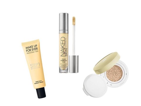 Warna kuning dapat digunakan untuk menyamarkan rona memar biru keunguan, warna urat pembuluh darah yang tampak di permukaan kulit, ataupun di area bawah mata yang terkadang terlihat kebiru-biruan ataupun ungu. Color corrector bewarna kuning cenderung paling umum digunakan, dan sangat baik untuk meratakan warna kulit, menciptakan base yang cerah sebelum pengaplikasian foundation. Warna kuning juga bisa digunakan sebagai eye shadow base untuk beberapa warna kulit tertentu.