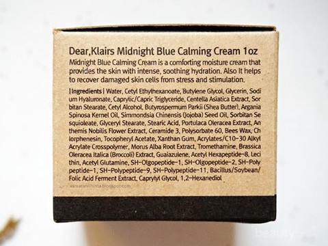Foto: https://asmaranishinta.blogspot.co.id/2017/01/klairs-midnight-blue-calming-cream.htmlTernyata nggak hanya tampak luar, ternyata kandungannya memiliki manfaat yang luar biasa untuk kulit. Aromanya pun berupa floral yang menenangkan. Sayangnya, skin care Korea ini belum masuk di pasaran Indonesia. Jika kamu tertarik, kamu bisa membelinya langsung dari online shop Korea. Harganya sekitar $25 atau Rp 350.000,-. It's absolutely worth to try!