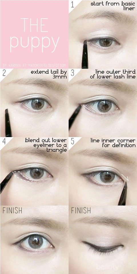 Bentuk eyeliner ini mudah dan praktis untuk diaplikasikan sehingga cocok untuk riasan mata sehari-hari. Kamu juga tidak perlu waktu yang lama membuatnya. Untuk membuat eyeliner puppy eyes natural kamu bisa menggunakan eyeliner dengan jenis apapun. Langkah pertama, buat garis satu arah di sepanjang garis bulu mata bagian atas dalam sekali usap. Langkah kedua, rapikan bagian ujung luar kelopak matamu dan pastikan eyeliner sejajar dengan bagian ujung luar matamu.