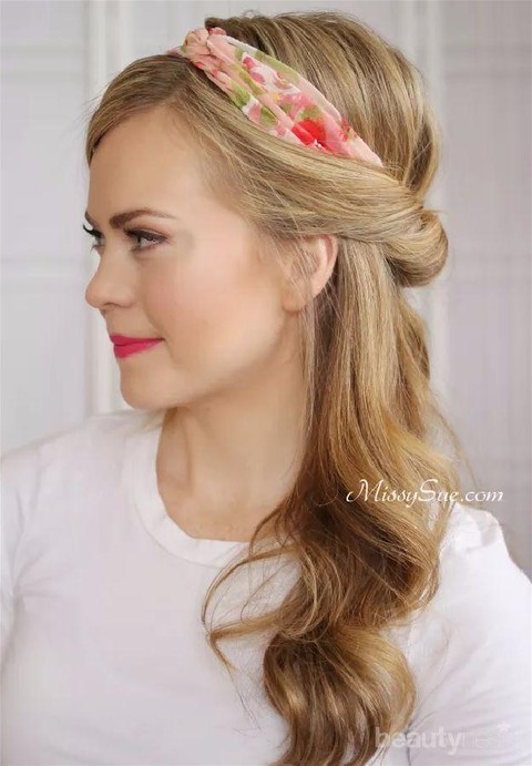 - Ambil sedikit bagian rambut disekitar headband, lilitkan pada headband.