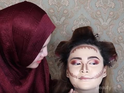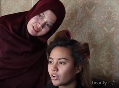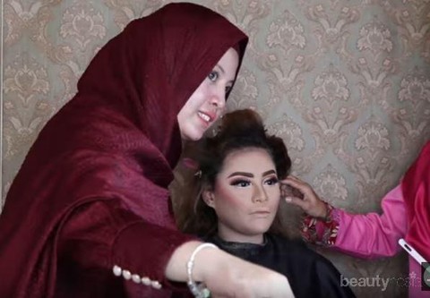 Foto: https://www.youtube.com/Pada tahap berikutnya, Khadijah menggunakan foundation yang memang lebih putih dibandingkan dengan warna dasar kulit Aurel. Khadijah menggunakannya tebal dan berlapis, awal ia gunakan di bagian mata. Setelah di bagian mata selesai, ia tidak langsung meratakan foundation satu muka, melaikan menggarap make-up di bagian mata dulu, ladies. Ia langsung menggunakan eye shadow dan finishing make-up bagian mata.