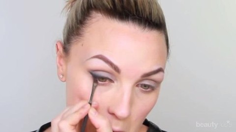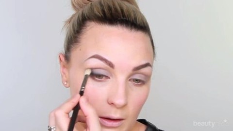 Setelah menggunakan eyeshadow berwarna abu-abu sebagai base pada mata, gunakan eyeshadow berwarna hitam untuk menggambar eyeliner wing pada mata dengan brush. Kemudian gambar garis hitam samar pada tulang alis untuk mempertegas batas garis mata.