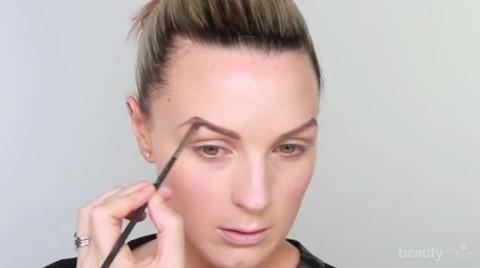 Puncak alis yang tinggi merupakan poin yang penting untuk membentuk bingkai wajah. Gambar puncak alismu lebih tinggi untuk menciptakan image tegas dengan eyeshadow dan brush. Rapikan bagian atas dan bawahnya dengan mengoleskan eyeshadow berwarna beige.