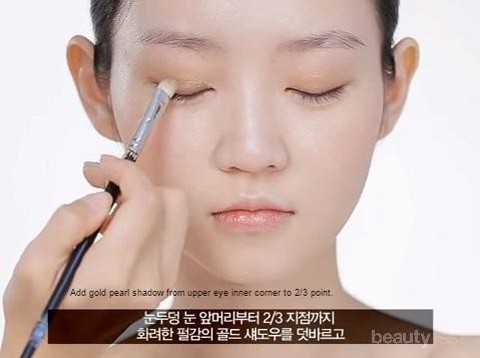 Usapkan cream shadow berwarna metalic bronze pada seluruh kelopak mata, kemudian lapisi dengan gold pearl shadow hingga 2/3 bagian kelopak mata. Untuk 1/3 bagian kelopak mata sisanya, usapkan warna gold brown point shadow. Menggunakan warna beige pearl, usapkan cream shadow pada tulang alis dan bagian bawah mata. Ini merupakan trik untuk membuat mata agar terlihat berkilau.