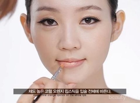 Gambar alis tipis-tipis menggunakan brow shadow warna light brown dengan brush. Untuk menyelesaikan tampilan nude, gunakan lipstick berwarna coral oranye lebih dulu. Kemudian gunakan lip gloss setelahnya agar bibir terlihat lebih bervolume dan bercahaya. Selesai!