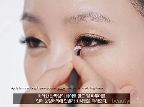 Setelah menempelkan bulu mata palsu dan menggunakan mascara, gunakan white gold pearl powder pada sudut mata bagian dalam dan bagian bawah mata agar tampak bercahaya.