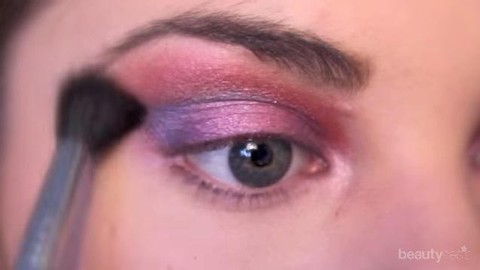 Gunakan eye primer lebih dulu, kemudian oleskan eyeshadow warna ungu pada seluruh kelopak mata. Tumpuk dengan eyeshadow berwarna ungu yang lebih tua pada kedua bagian ujung mata untuk menciptakan efek shadow. Oleskan pula eyeshadow warna merah cranberry di atas garis kelopak mata untuk mempertegas bentuknya, ratakan dengan brush.