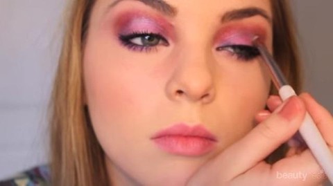Gunakan liquid liner tipis-tipis dan buat wing pada bagian ujungnya. Gunakan pula pencil liner pada bagian dalam garis matamu untuk hasil yang intens. Setelahnya, tambahkan eyeshadow ungu pada bagian bawah mata kemudian gunakan mascara pada bulu mata bagian atas dan bawah mata. Tambahkan glitter white shadow pada bagian tengah kelopak matamu agar eyeshadow terlihat terang dan mencolok.