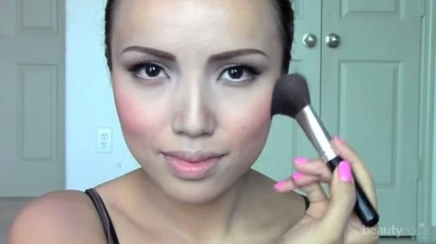 Usapkan blush berwarna light pink untuk menambahkan kesan healthy glow pada tulang pipimu dari depan mengarah ke belakang.