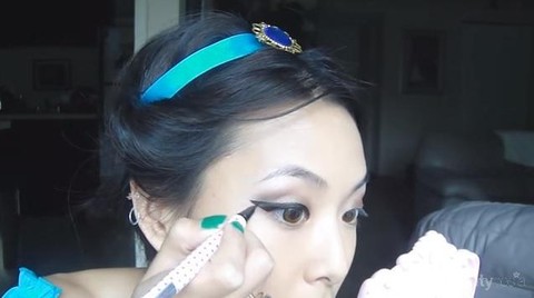 Jasmine digambarkan memakai eyeliner yang sangat tebal. Trik ini dapat dicapai dengan menggambar eyeliner secara tebal terutama pada bagian tengah hingga keluar mata. Gambar garis luar terlebih dulu, tarik hingga garis ujungnya sedikit melebihi panjang alismu, kemudian isi hingga penuh dengan liquid eyeliner. Jangan lupa, tebali seluruh garis matamu baik di bagian atas dan bawah mata dengan pencil eyeliner setelahnya.