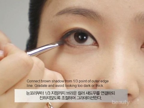 Menggunakan eyeshadow berwarna cokelat, gambar underline mulai dari sudut luar garis mata yang telah digambar sebelumnya hingga mencapai 1/3 bagian mata. Gambarlah secara tipis-tipis dan jangan sampai terlalu tebal.