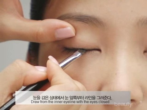 Dalam keadaan mata tertutup, gambar eyeliner pada garis mata bagian luar dari dalam mengarah keluar. Hindari membentuk wing pada bagian ujung agar terlihat natural.