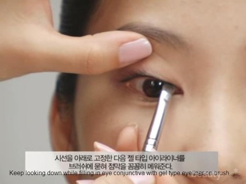 Gunakan gel eyeliner dengan brush untuk menggambar garis mata bagian dalam. Langkah ini penting agar bagian putih pada garis mata tidak terlihat sehingga dapat menyamarkan bentuk asli dari sudut mata.