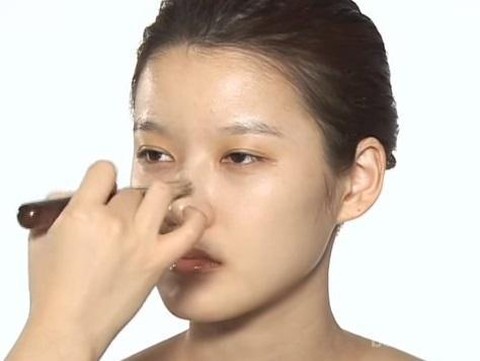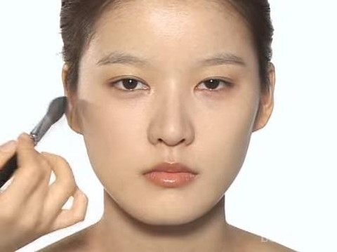 Usapkan foundation yang sesuai dengan warna kulit dengan menggunakan brush. Ikuti bentuk wajah dan usapkan brush dari arah dalam mengarah keluar.
