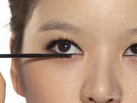 Jepit bulu mata hingga melengkung, kemudian beri mascara pada bulu mata bagian atas dan bawah hingga lentik dan bervolume.