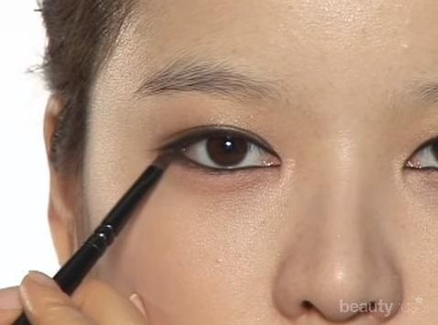 Menggunakan gel liner dan brush, gambar eyeline pada garis mata bagian dalam lebih dulu. Kemudian gambar eyeline di sepanjang garis mata bagian atas dan bawah secara penuh.