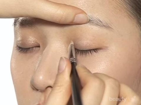 Campur eyeshadow berwana beige dengan medium brown pada seluruh kelopak mata, ratakan ujungnya di dekat batas garis kelopak mata dengan brush agar menyatu.
