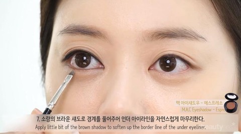 Untuk garis mata bagian bawah, gunakan brown gel eyeliner. Kamu bisa memulai menggambar garis mata mulai dari sudut mata bagian luar jika kamu merasa kesulitan untuk mengetahui seberapa banyak gel yang kamu perlukan.