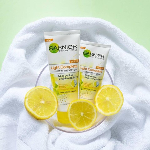 Garnier Light Complete White Speed Multi Action Brightening Scrub merupakan salah satu produk dari rangkaian seri light complete Garnier. Memiliki scrub yang sangat lembut dan mudah dibilas, produk ini sangat cocok bagi kamu pemilik jenis kulit yang sensitif. Mengandung 1.000 micro-beads dan sari buah lemon mampu membersihkan kulit secara menyeluruh dan mencerahkan kulit sejak pemakaian pertama.